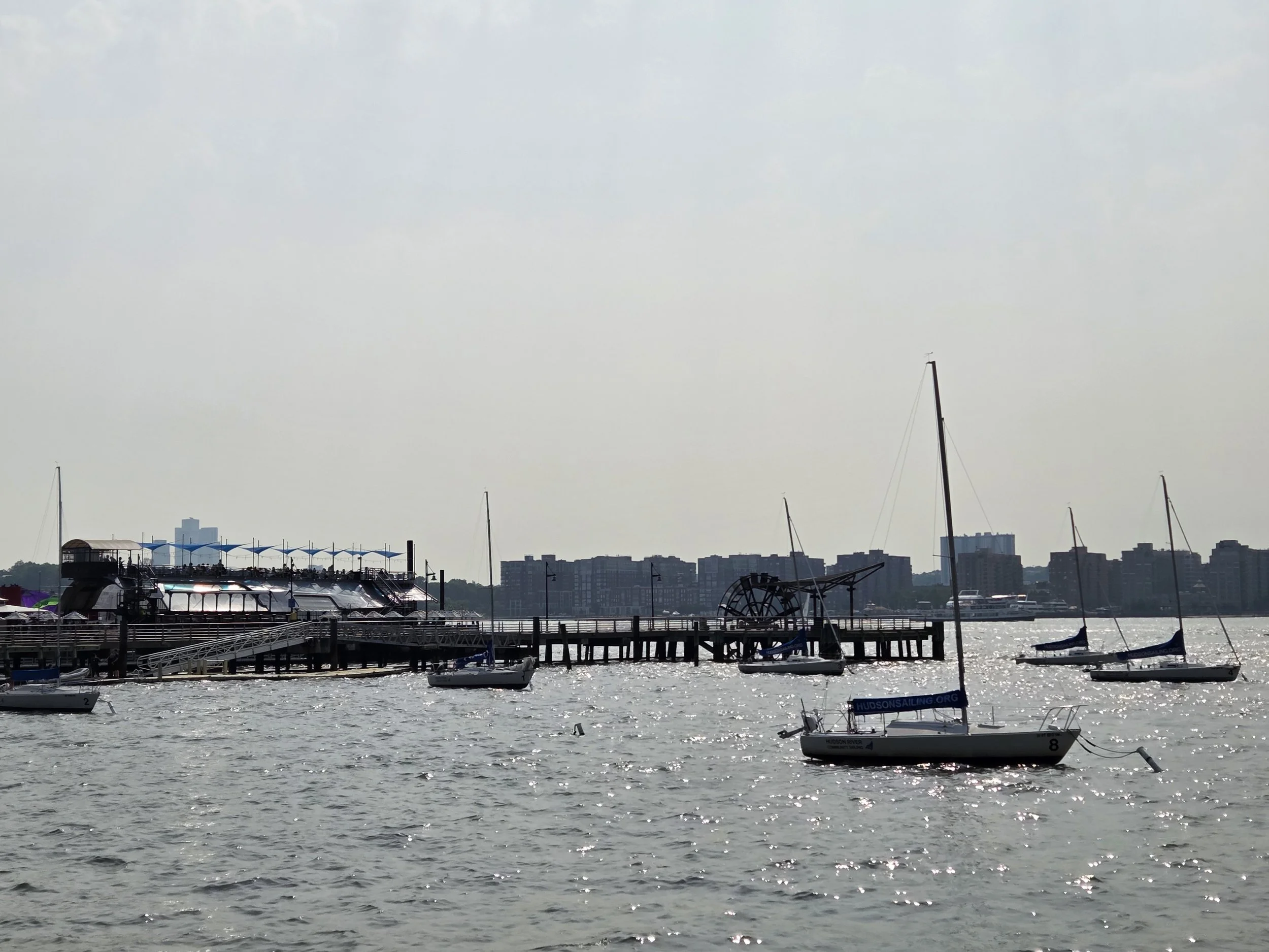 The wind was strong from the north at first—perfect sailing conditions. We tacked our way upriver, past Hudson Yards, the Intrepid, and beyond. By the time I took the helm, however, the wind had died. We attempted to continue north on a run, but with little breeze and the sun beating down, it was slow going and a bit too hot.